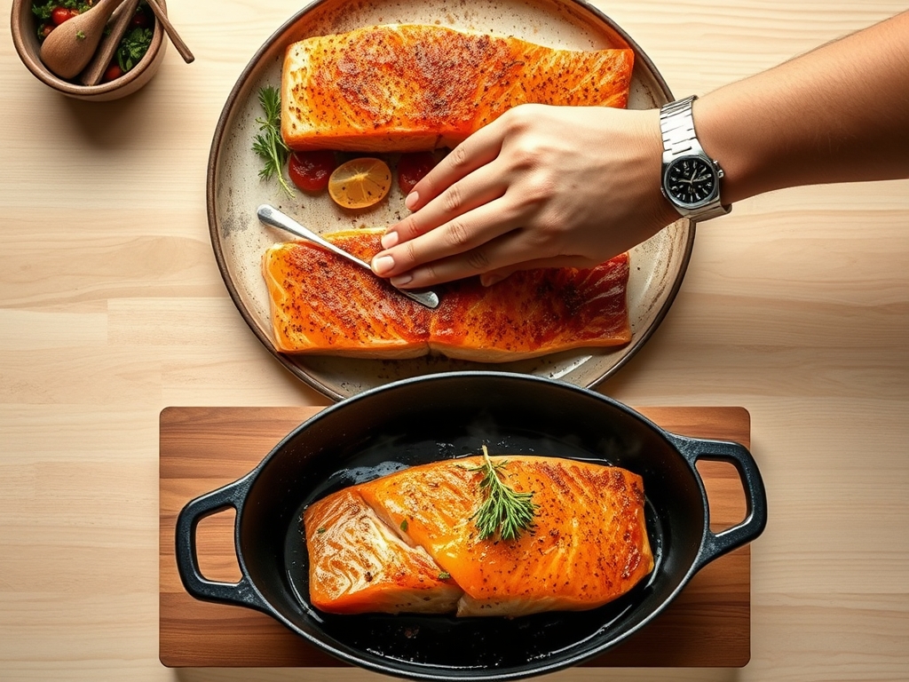 Pro Tip: This step facilitates conduction. Since air is a poor heat conductor, the thin film of oil creates a continuous medium that transfers energy more effectively, leading to uniform cooking across the varying thickness of the salmon.